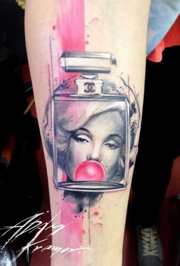 手臂有趣的组合彩色香水瓶与女人肖像纹身