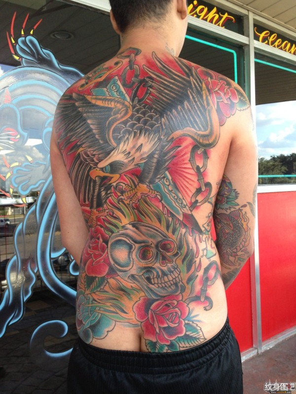 雄鹰抓骷髅满背纹身图案