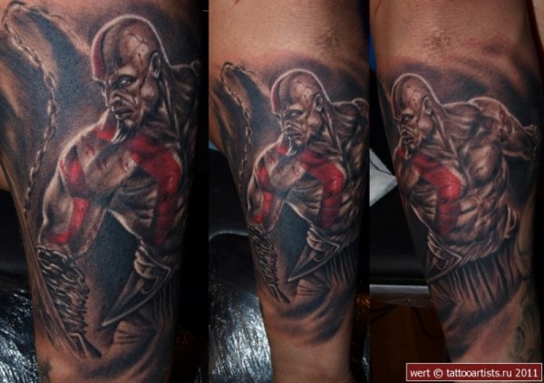 手臂彩色逼真的血腥野蛮人物纹身图案