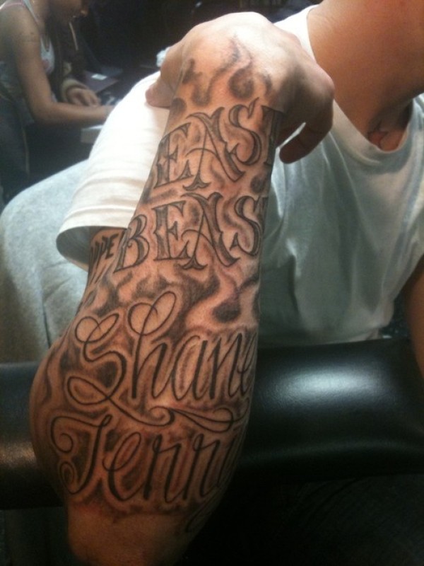 手臂棕色有趣的英文字母纹身图案