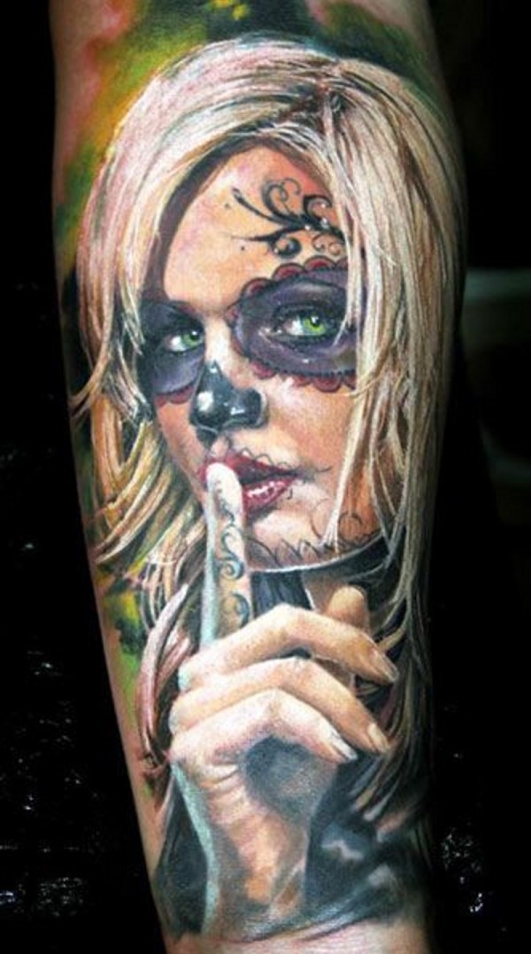 手臂彩色逼真的金发死亡女孩纹身