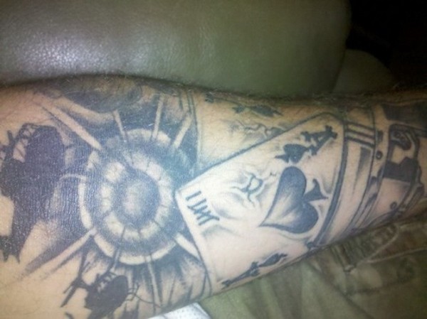 手臂灰色墨水卡枪和扑克牌纹身图案