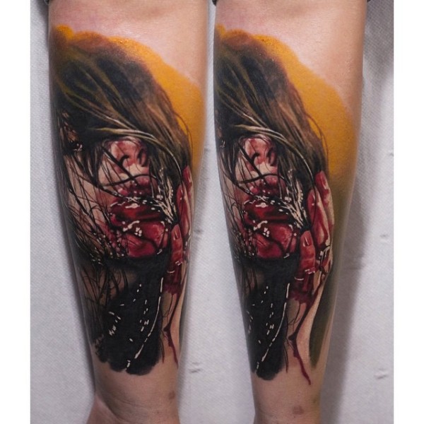 手臂彩色恐怖血腥的女人肖像纹身图案