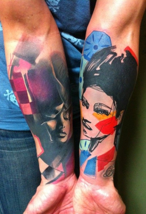 手臂彩色逼真的女人肖像纹身图案