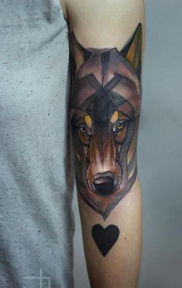 手臂彩色狼头与爱心纹身图案