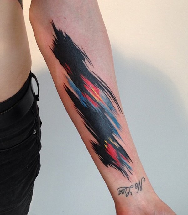 手臂水彩彩色斑点和英文纹身图案