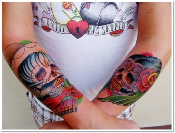 男性手臂彩色墨西哥糖骷髅纹身图片