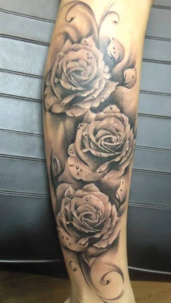 腿部灰色逼真的玫瑰与水滴纹身图案