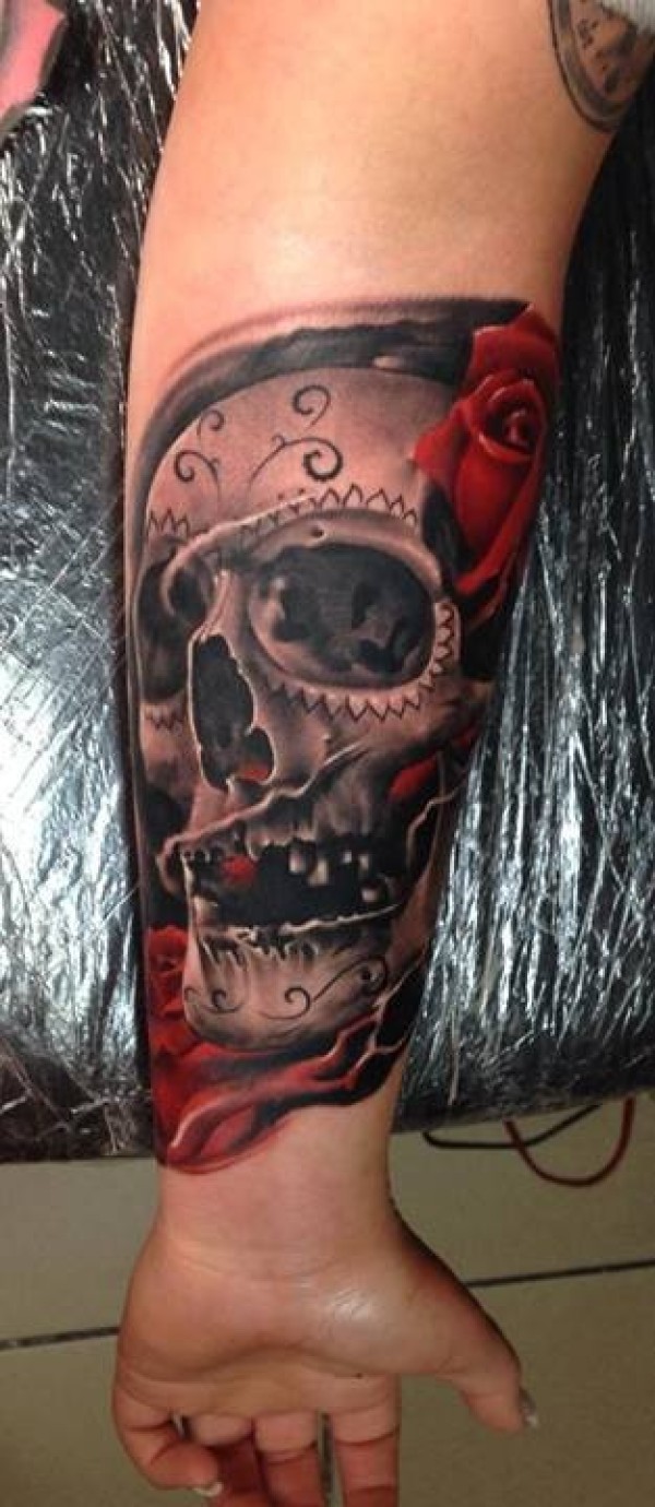 腿部逼真的糖头骨与红玫瑰纹身图案