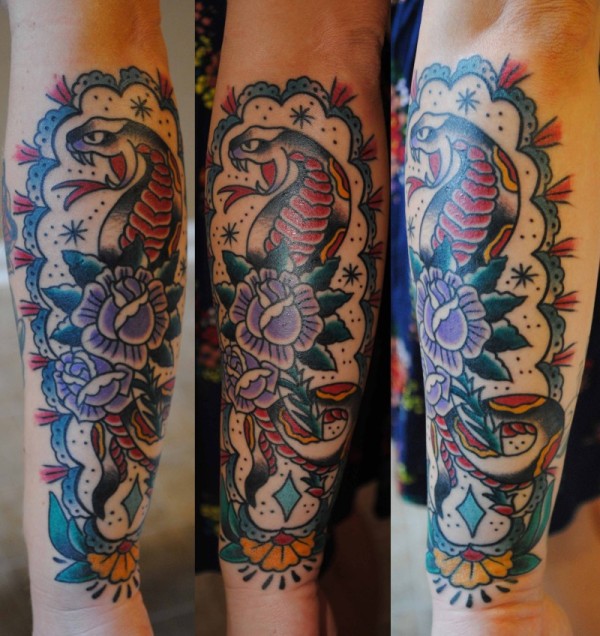 手臂彩色老蛇与紫玫瑰纹身图案