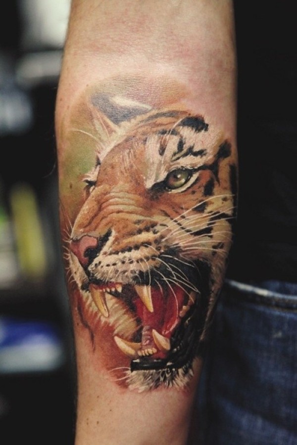 手臂彩色逼真的老虎头纹身图片