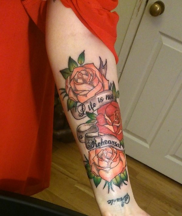 手臂彩色漂亮的玫瑰和铭文纹身图案