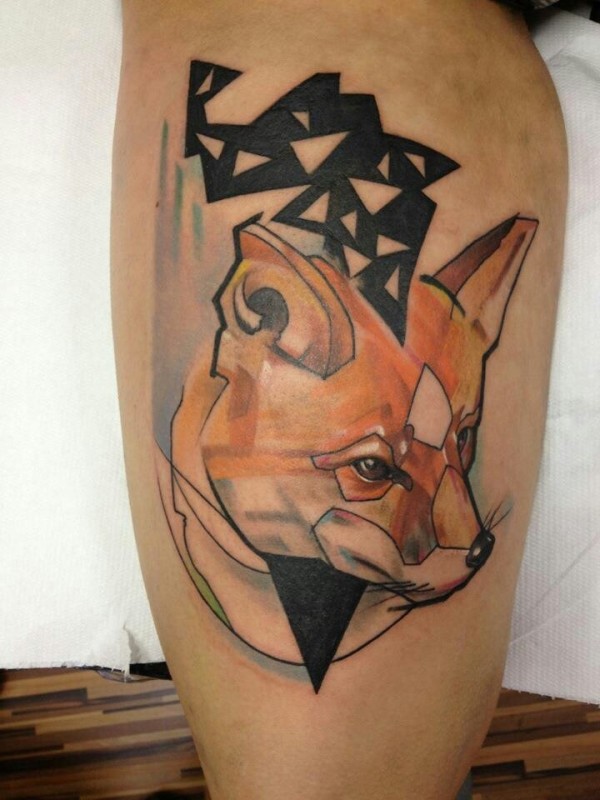 腿部彩色几何狐狸纹身图案