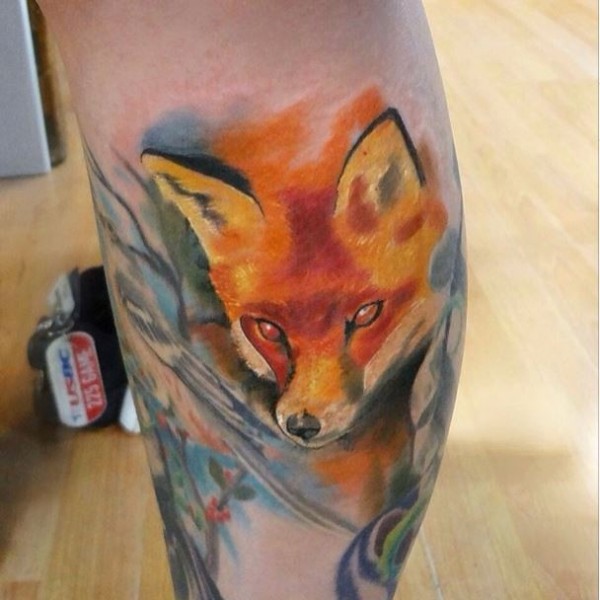 腿部水彩色狐狸头纹身图案