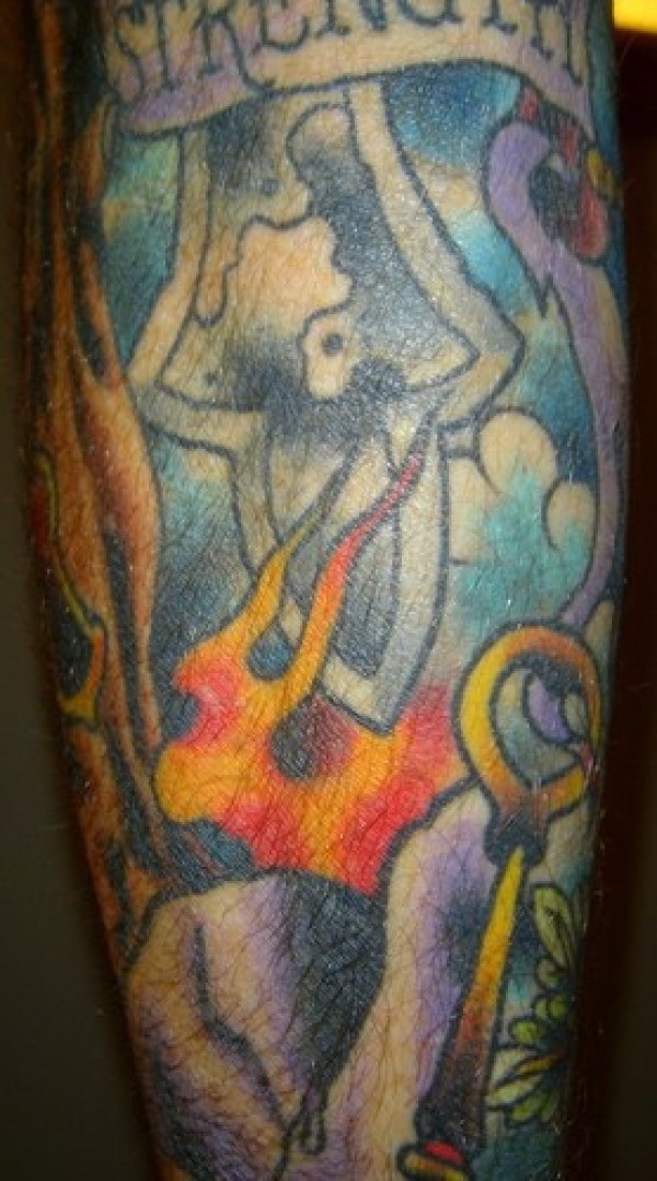 手臂彩色燃烧的盾牌纹身图案