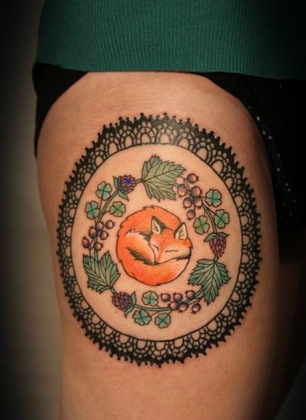 腿部彩色大睡狐风格与花纹身图案