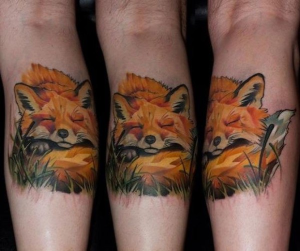 腿部彩色睡觉的狐狸纹身图案