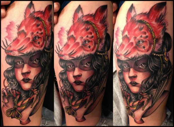 肩部现代传统风格的彩色神秘女人与头盔纹身