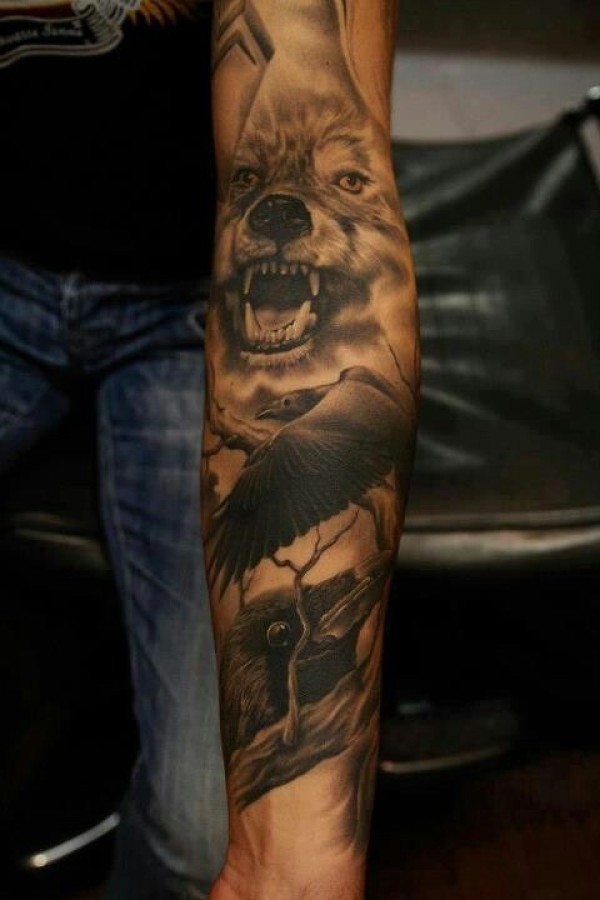 花臂棕色逼真的乌鸦和狼纹身图案