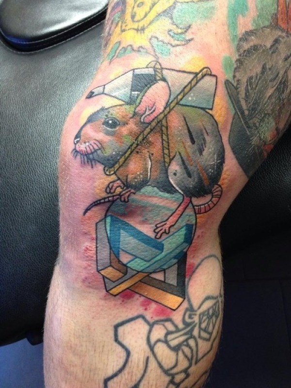 腿部彩色很有趣的老鼠拴铅笔纹身图案