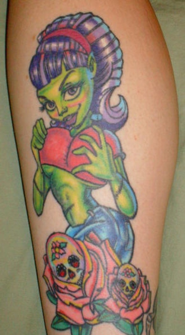 腿部彩色搞笑僵尸女孩纹身图案