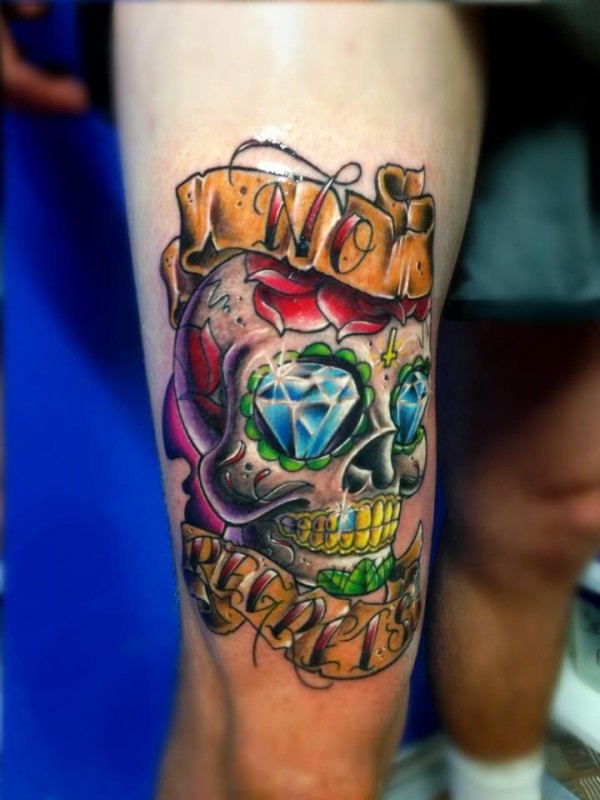 腿部彩色滑稽的骷髅与钻石纹身图案