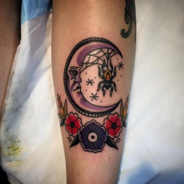 腿部老派风格的彩色月亮与蜘蛛纹身