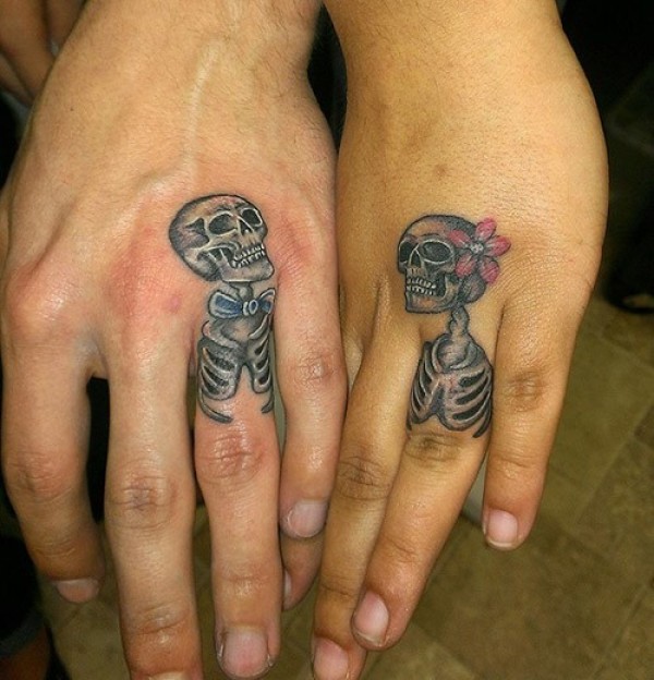 情侣有趣的彩色男人和女人骨架纹身图案