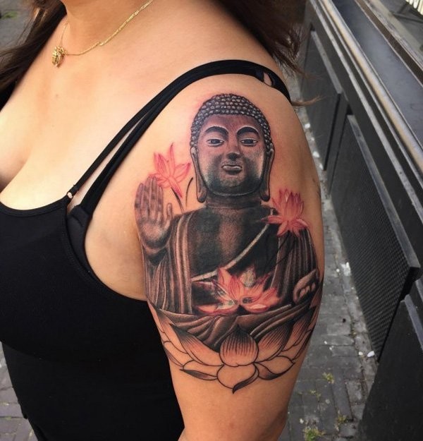 女性肩部彩色如来佛祖雕像纹身图案