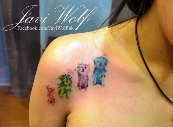 肩部滑稽的水彩画风格小狗纹身图案