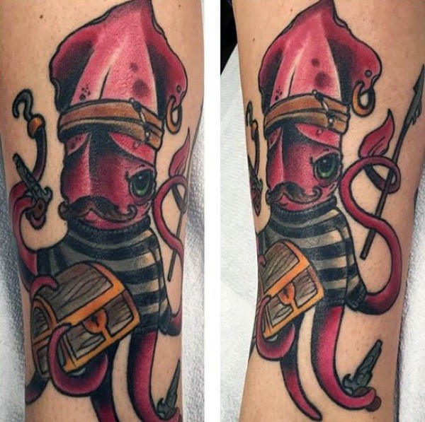 腿部彩色有趣的海盗风彩色鱿鱼纹身