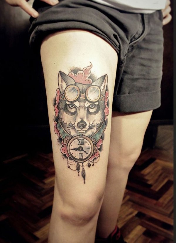 腿部旧学校滑稽狼与老式时钟纹身
