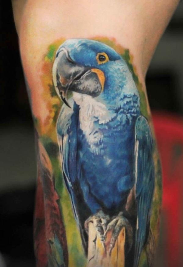 腿部彩色逼真有趣的鹦鹉纹身图案