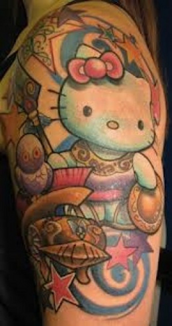 肩部彩色有趣的凯蒂猫主题纹身图案
