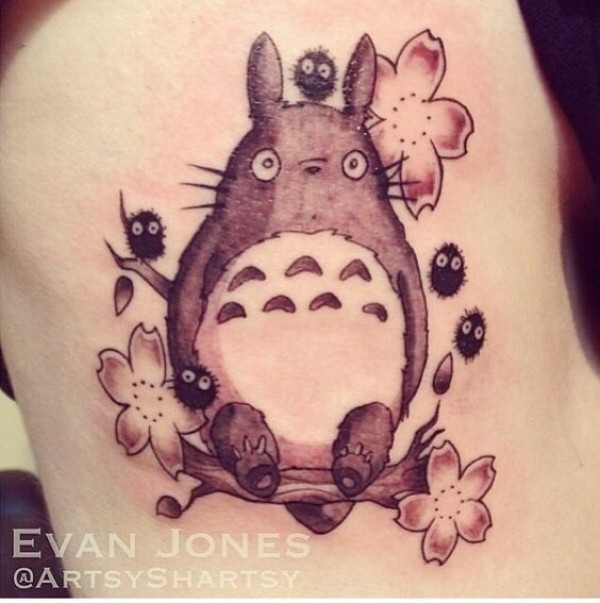 腰侧棕色滑稽的龙猫与花朵纹身图案