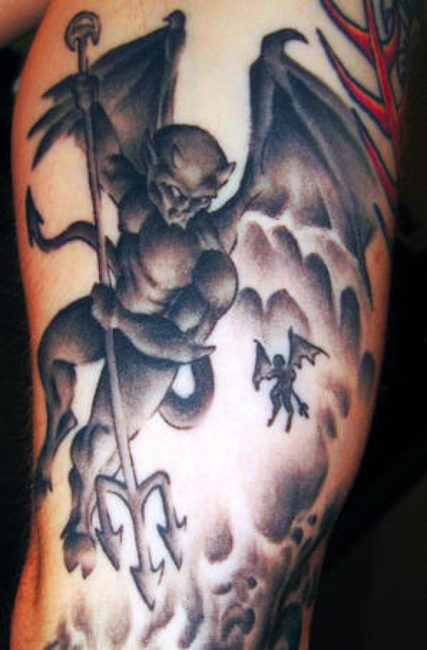腿部灰色三叉戟的小鬼纹身图案