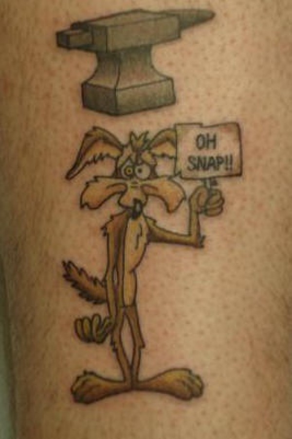 腿部卡通豺狼举牌纹身图案