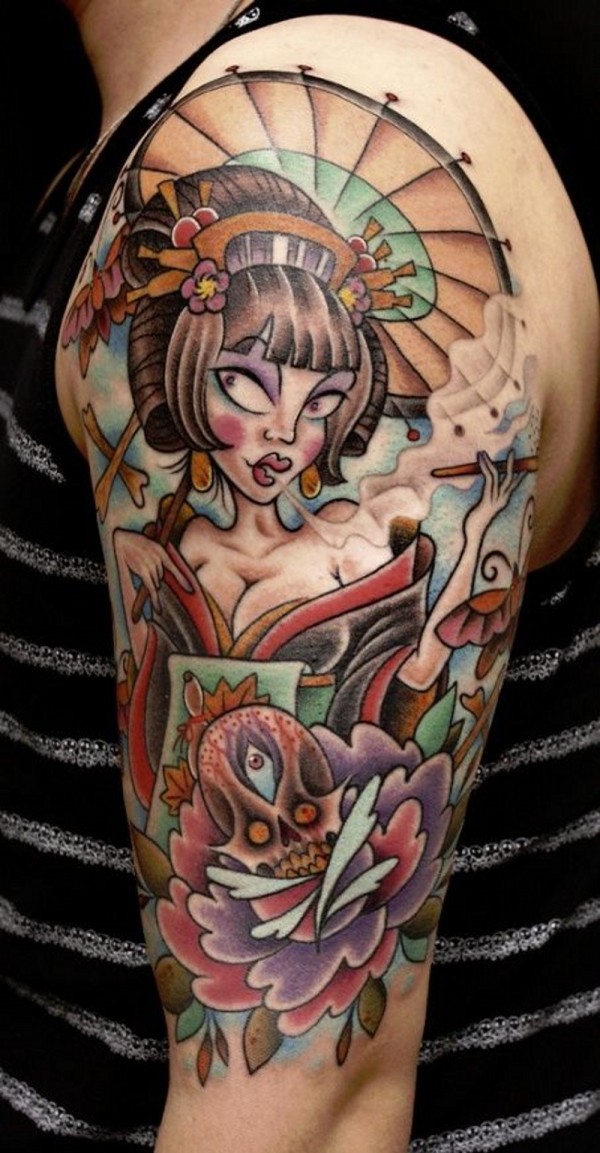 肩部漫画风格彩色吸烟艺妓和花朵纹身