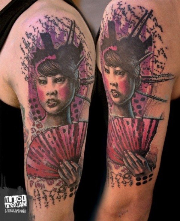 肩部新学校的插画风格色彩艺伎女人肖像纹身