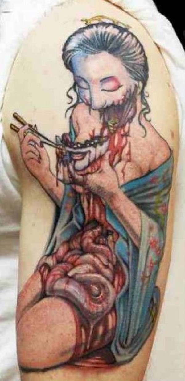 肩部彩色可怕的血腥僵尸艺妓纹身图案