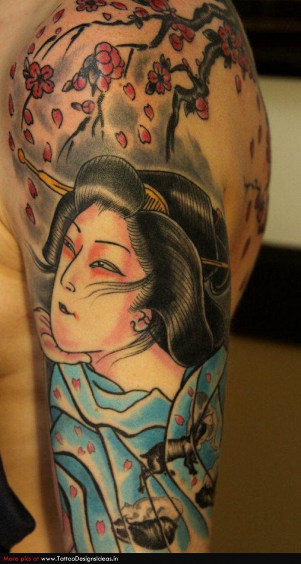 肩部传统彩色艺妓与开花的树纹身