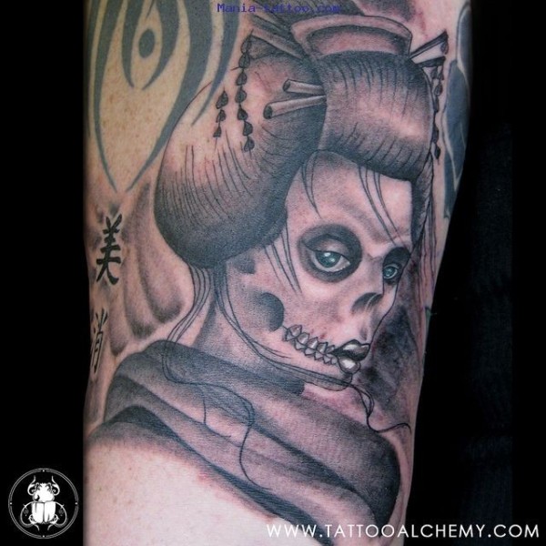 肩部灰色恶魔艺妓纹身图案