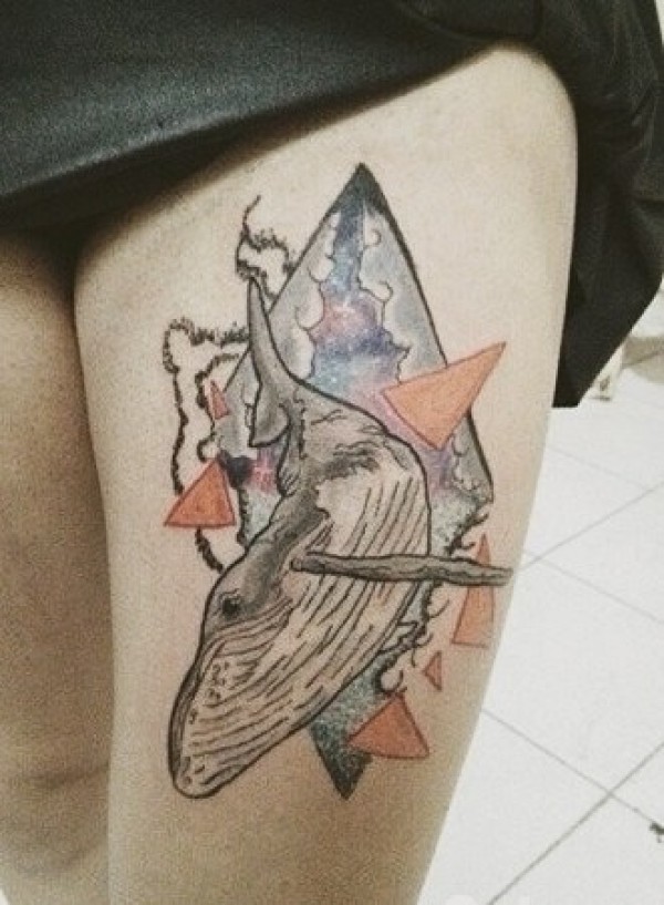 腿部彩色简单的几何风格鲸鱼纹身图案