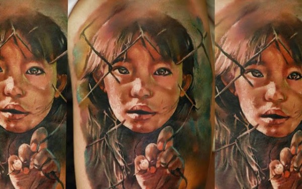肩部现实主义风格的彩色小女孩肖像纹身