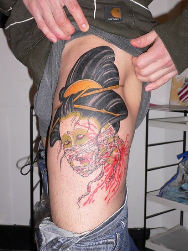腿部彩色受伤的日本艺妓纹身图案