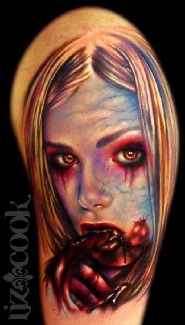 肩部令人毛骨悚然的血腥吸血鬼纹身