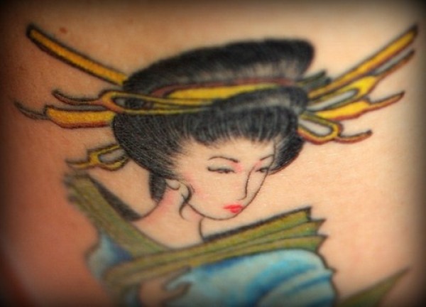 手臂彩色好看的艺伎纹身图案