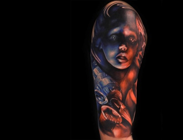 肩部彩色恐怖风格的女孩肖像纹身图案