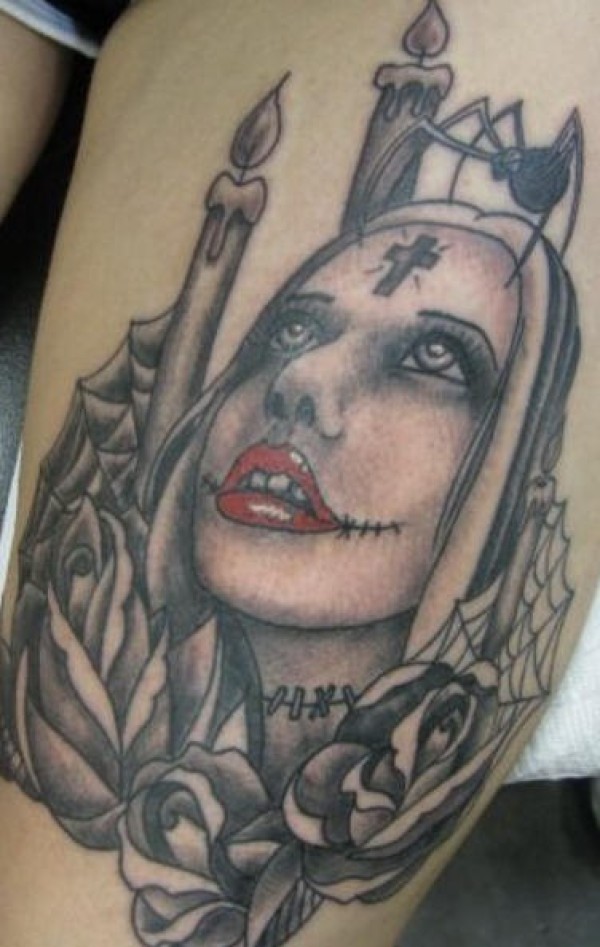 腿部僵尸女孩和蜘蛛纹身图案