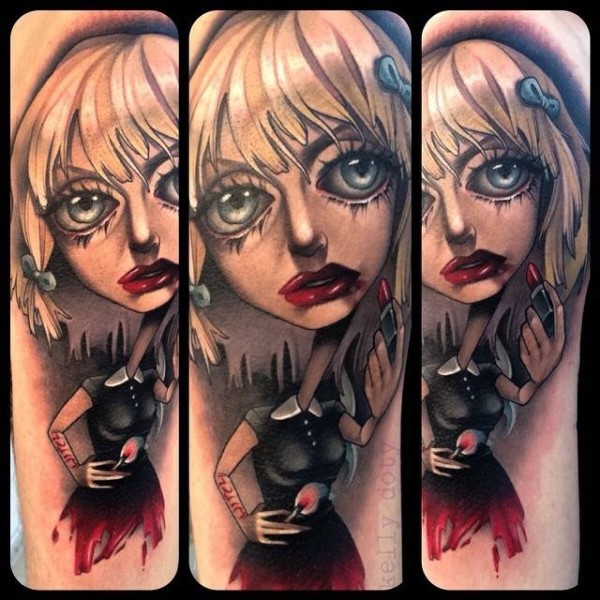 肩部彩色卡通可怕的女孩肖像纹身图案